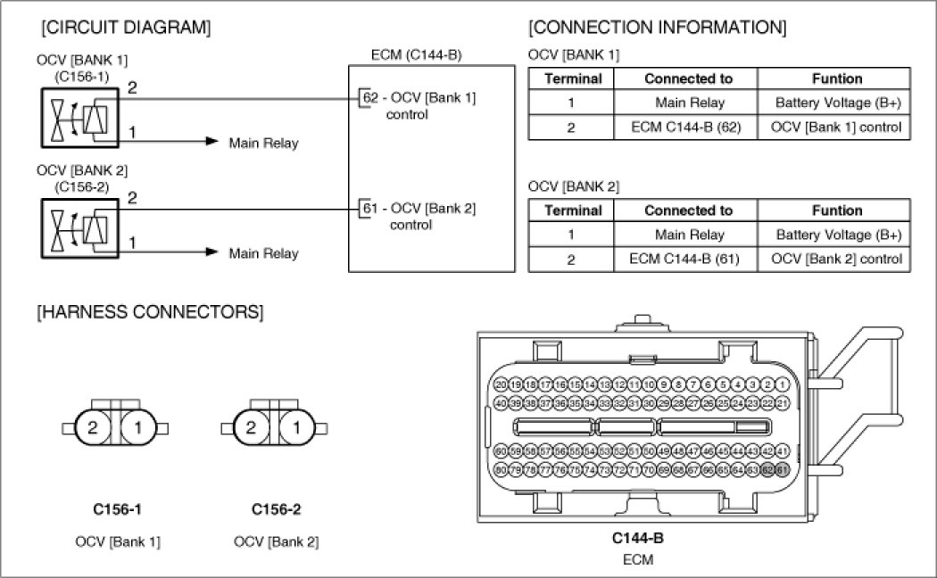 Continuously Variable Valve Timing (CVVT) system controls valve overlap with forcibly activating the camshaft and adjusts EGR (Exhaust Gas Recirculation) amount. It decreases exhaust gas (NOx, HC) and improves fuel economy, idle state, torque in low speed and power in high speed. This system uses engine oil pressure and consists of the two CVVT Oil Control Valve (OCV) in each bank which supplies oil to cam phaser according to PWM (Pulse With Modulator) signal of the PCM, a CVVT Oil Temperature Sensor (OTS) which detects the oil temperature and a cam phaser which is installed on the end of the camshaft and converts camshaft phase. The oil getting out of the CVVT oil control valve flows into the cam phaser and rotates the rotor inside cam phaser. At this time, the camshaft rotates with the rotor and the cam phase is changed.