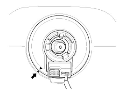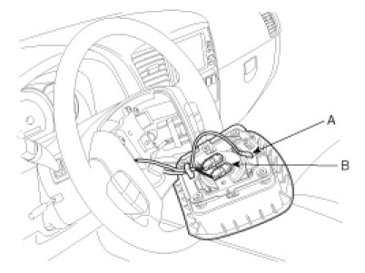 4. Release the connector locking pin, then disconnect the driver airbag module connector(B).