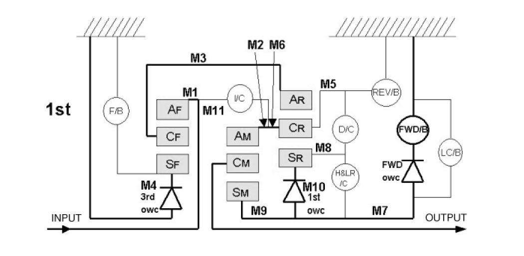 Input shaft->Front internal->Front carrier->Rear internal input shaft->Middle internal->Rear carrier->Rear sun gear->Middle sun carrier->Middle carrier->Output shaft