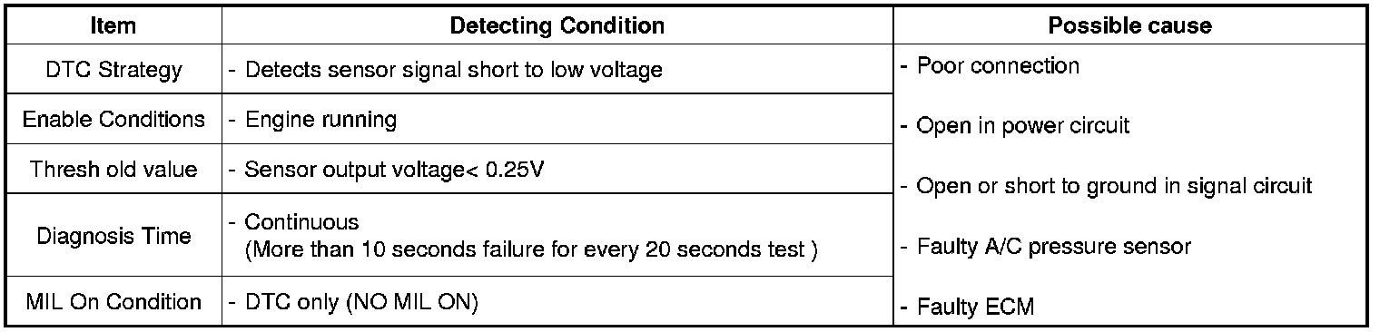 Checking output signals from A/C pressure sensor under detecting condition, if an signal below 0.25V lasts for more than 10 sec., ECM sets P0532.