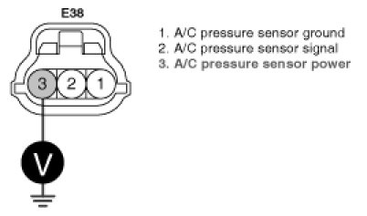 4. Measure the voltage between terminal 3 of A/C pressure sensor harness connector and chassis ground.