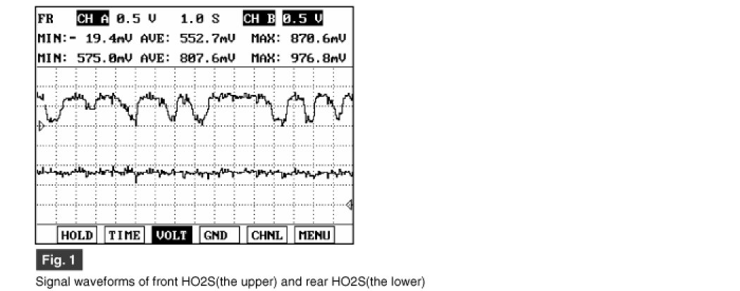 After warming-up, if accelerator pedal is released suddenly around 4000rpm, the HO2S signal reading will be lower than 200mV resulting from Fuel cut-off for the moment. Conversely, if suddenly accelerator pedal is depressed, HO2S signal reading will be around 0.6V ~1.0V. At idle, Normally HO2S signal will switch from lean to rich with 3 Hz. At higher engine RPM, the switching frequency increases.
