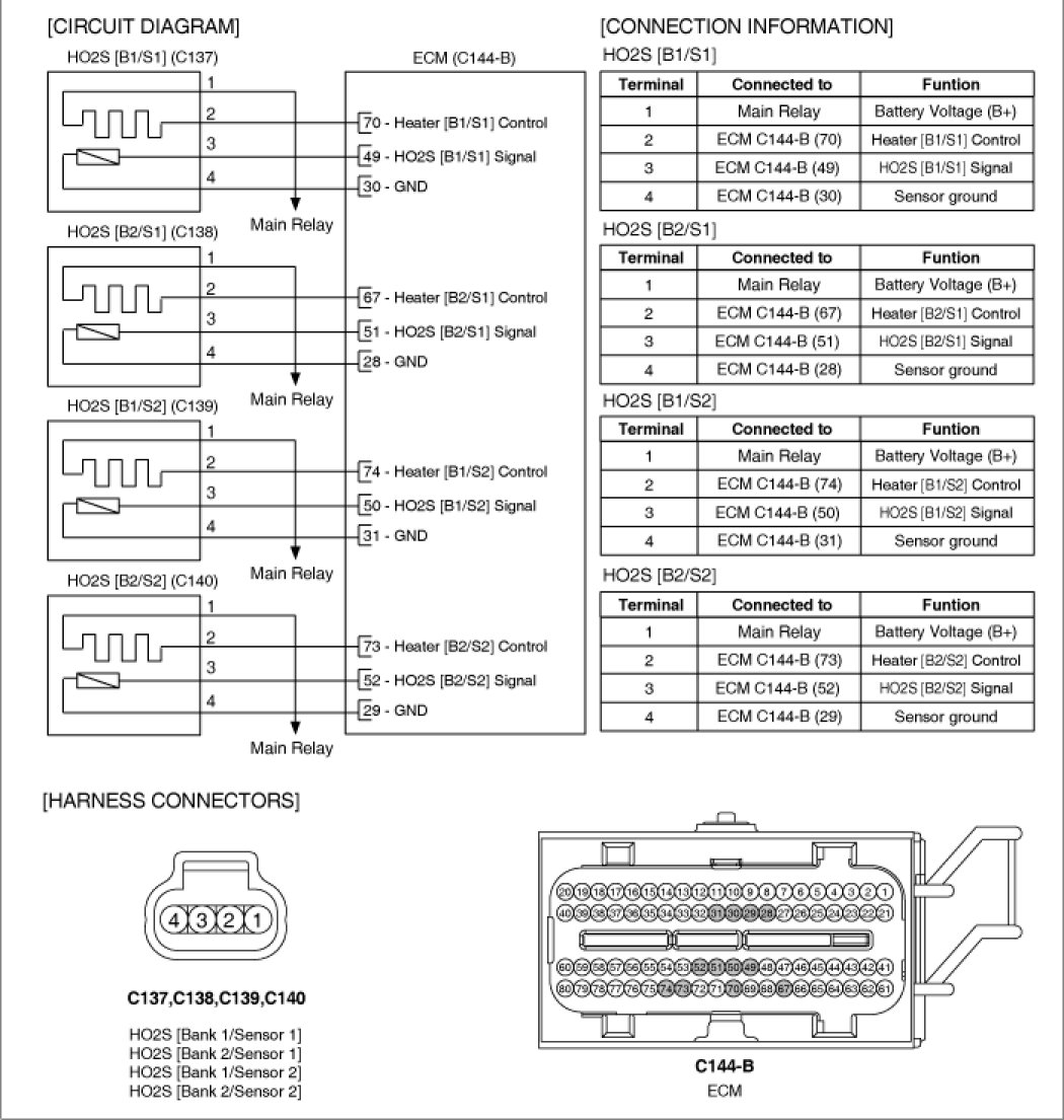 Heated Oxygen Sensor (HO2S) consists of zirconium and alumina and is installed on upstream and downstream of the Manifold Catalyst Converter (MCC). After it compares oxygen consistency of the atmosphere with the exhaust gas, it transfers the oxygen consistency of the exhaust gas to the PCM. When A/F ratio is rich or lean, it generates approximately 1V or 0V respectively. In order that this sensor normally operates, the temperature of the sensor tip is higher than 370°C (698°F). So it has a heater which is controlled by the PCM duty signal. When the exhaust gas temperature is lower than the specified value, the heater warms the sensor tip.