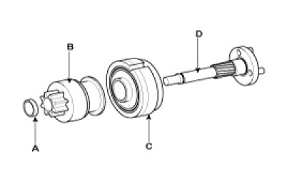 11. Disconnect the stop ring (A), overrunning clutch (B), internal gear (C) and planet shaft (D).