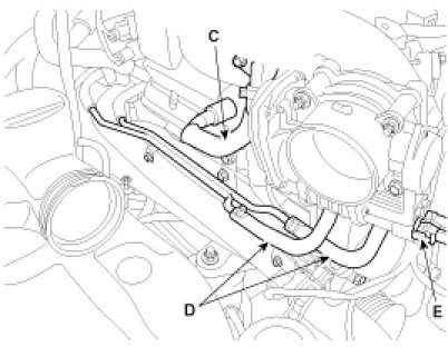 21. Connect the other breather hose(A), the Positive Crankcase Ventilation (PCV) hose(C) and the Electronic Throttle Control(ETC) cooling hoses(D), ETC connector(E).