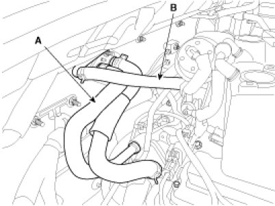 8. Remove heater hose(A) and disconnect the brake vacuum hose(B).