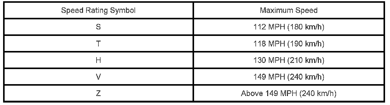 The chart above shows some of the different speed ratings currently being used for passenger car and light truck tires. The speed-rating symbol is part of the tire size designed on the sidewall of the tire. This symbol corresponds to the tire's designed maximum safe operating speed.