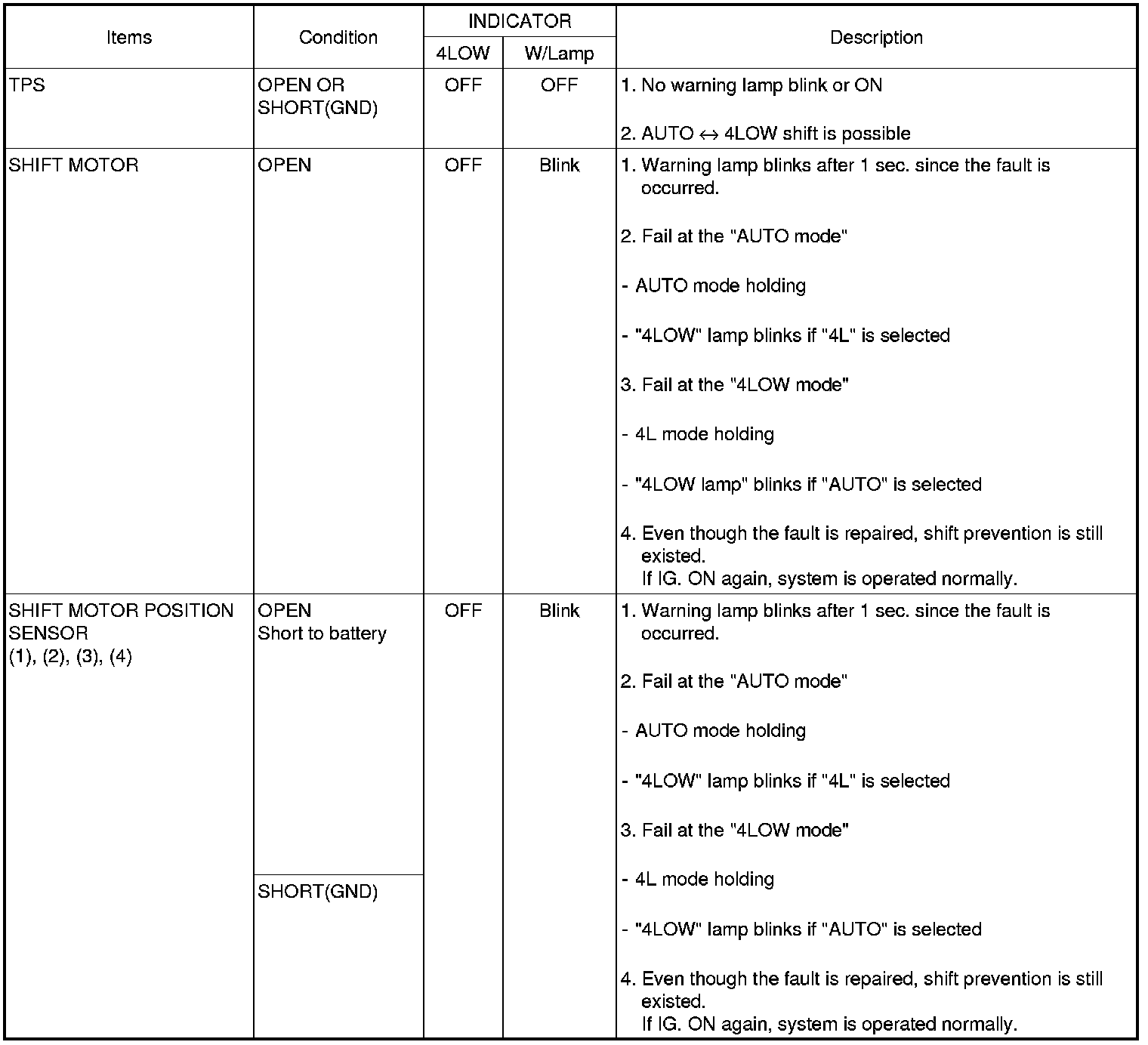 1. If a malfunction occurs, the 4WD indicator lamp will blink to warn the driver.
