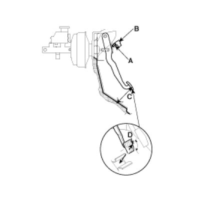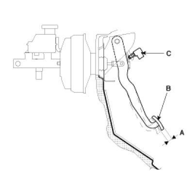 2. If the pedal free play is out of specification, adjust the brake switch (C). If the pedal free play is insufficient, it may result in brake drag.
