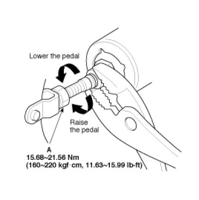 3. Loosen the pushrod locknut (A), and screw the pushrod in or out with pliers until the standard pedal height from the floor is reached. After adjustment, tighten the locknut firmly. Do not adjust the pedal height with the pushrod depressed.