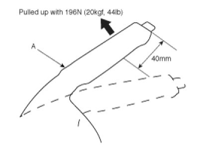 3. After the full stroke operation of the brake lever over 3 times for setting the cable, the travel must be between 8 notches when applying a force of 196N(20kgf, 44Ib) at 40mm from the end of lever assembly (excluding button) by adjusting nut (A).