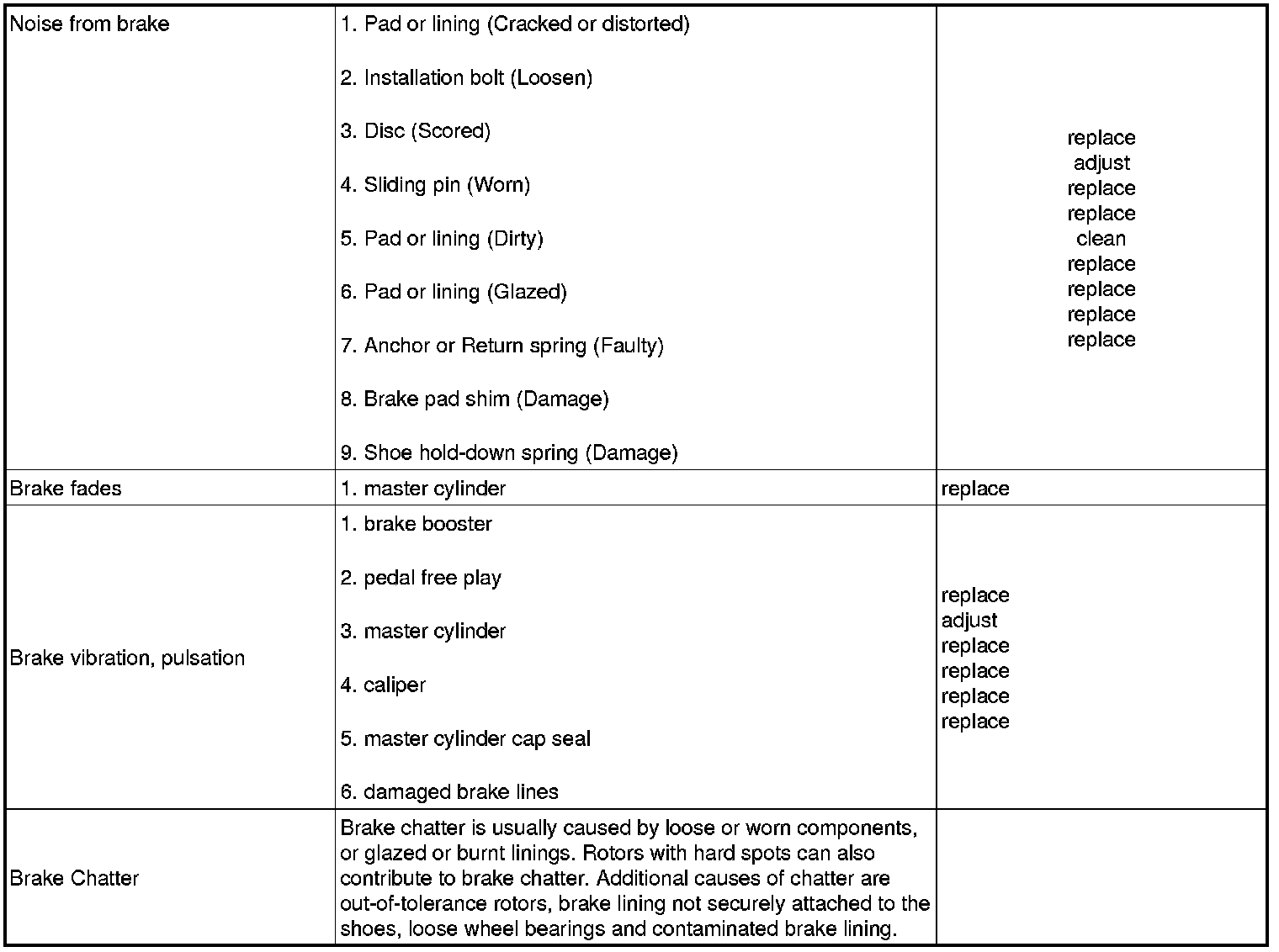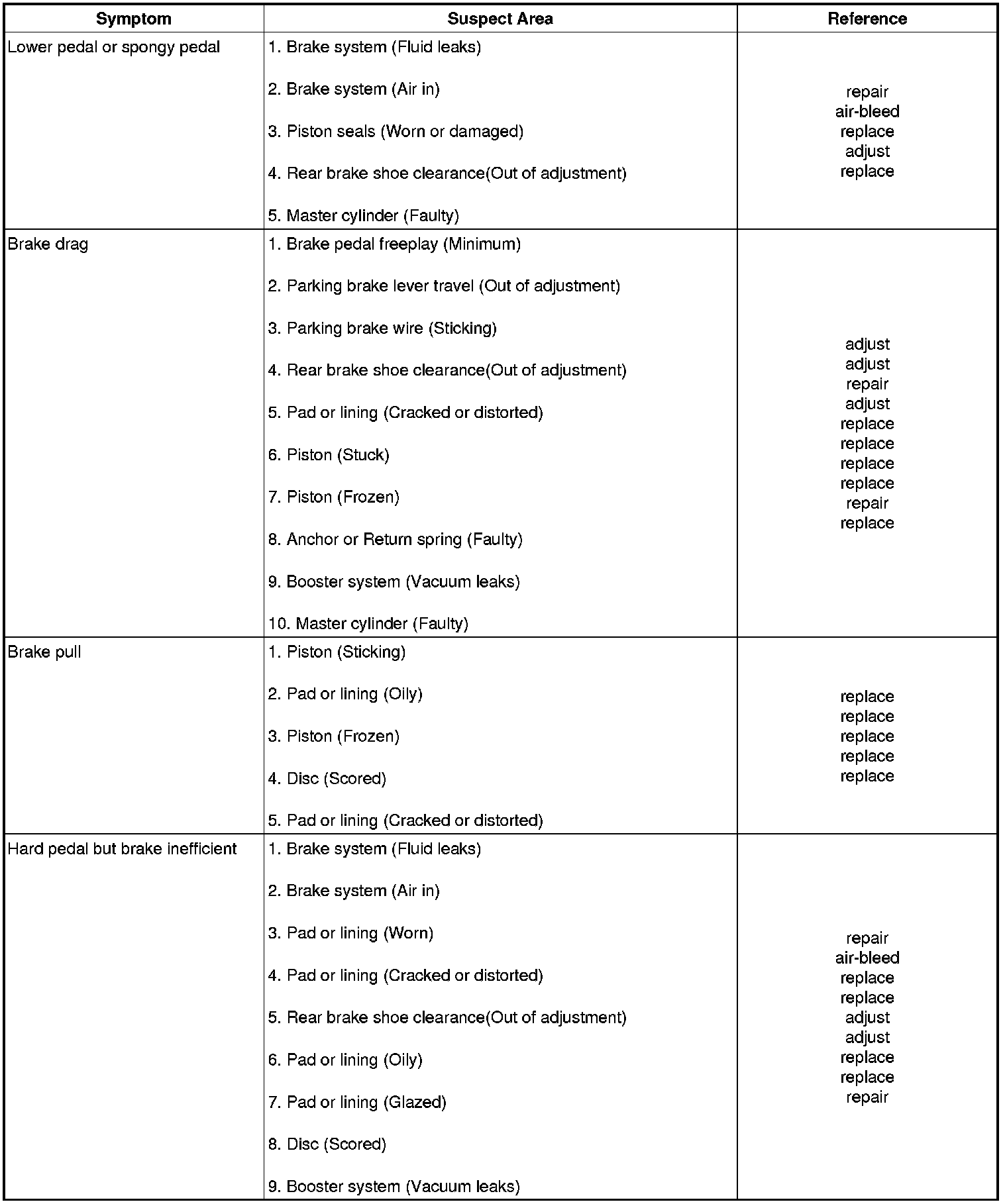 PROBLEM SYMPTOMS TABLE