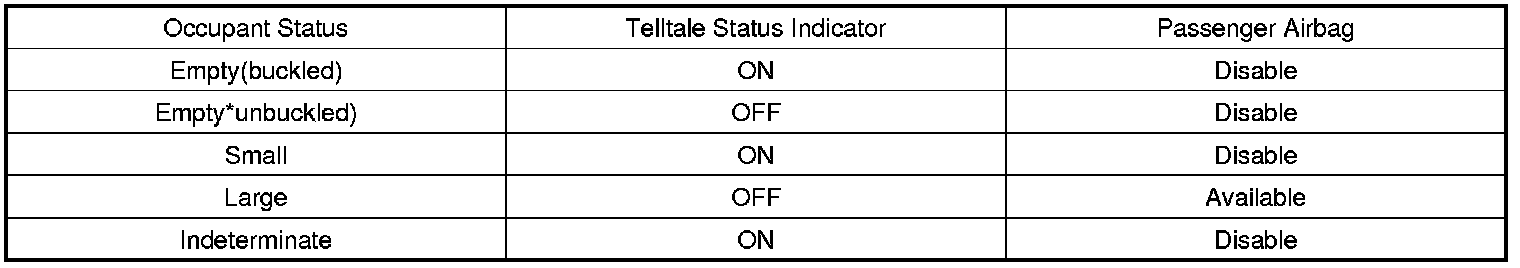 The Telltale Lamp indicates the Passenger Airbag(PAB) enable disable status based on occupant status of passenger seat. If the passenger seat is occupied with child (or child seat), the Passenger Airbag is disabled and the Telltale Lamp is turned ON to inform the driver that the PAB is disabled. As soon as operating voltage is applied to the SRSCM ignition input, the SRSCM activates telltale lamp prove out. OCS will send an indeterminate status to the SRSCM as a default setting for passenger airbag deployment during the prove out period. After crash if OCS gets reset and sends the indeterminate status, the telltale lamp will be ON as long as the occupant status is in the indeterminate status. Occupant status information and telltale status are as below table.