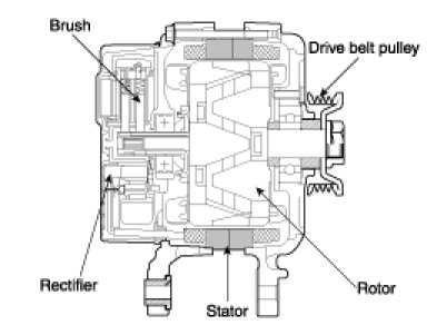 The generator is regulated by the battery voltage detection system. The main components of the generator are the rotor, stator, rectifier, capacitor brushes, bearings and V-ribbed belt pulley. The brush holder contains a built-in electronic voltage regulator.