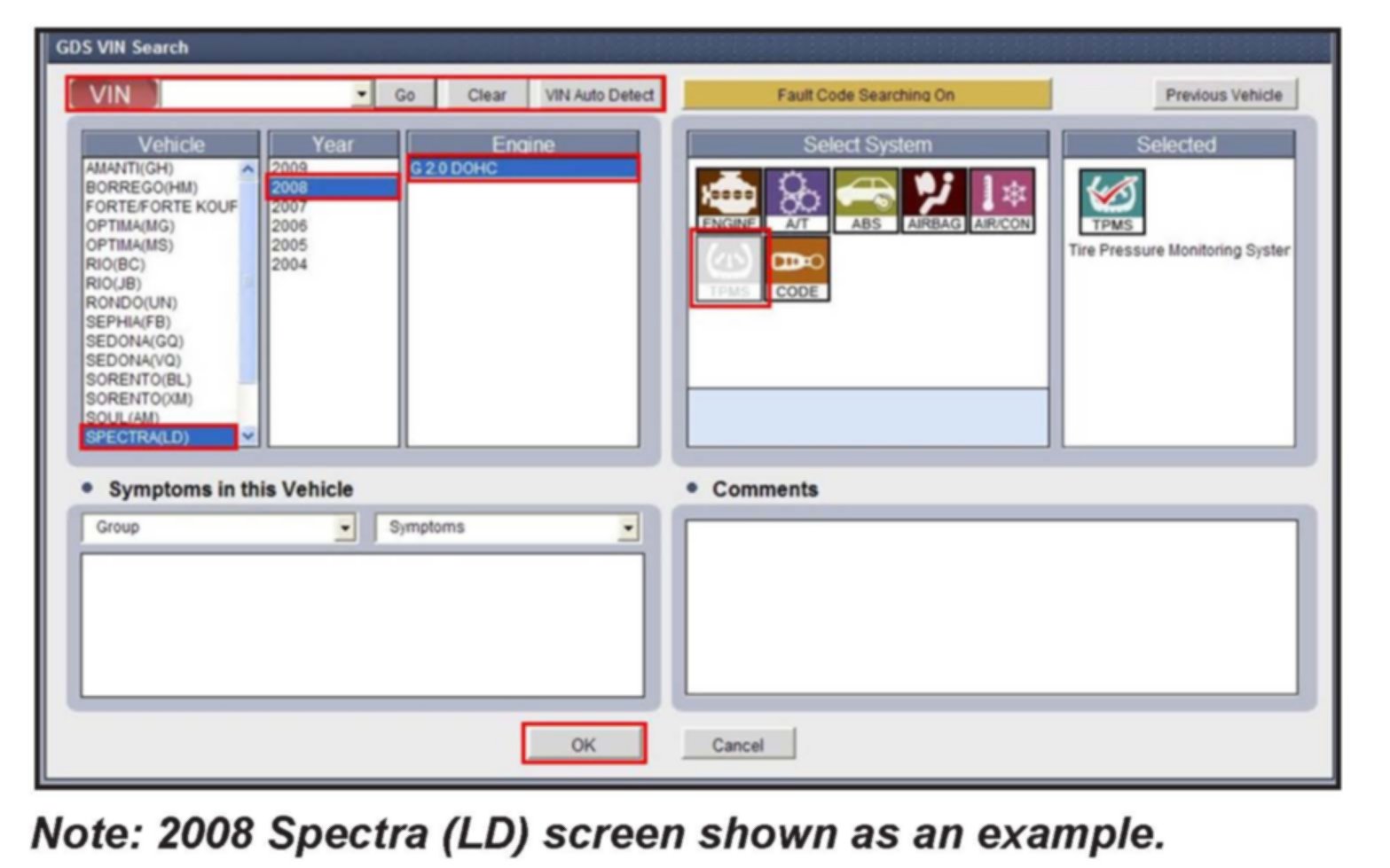 KMA is conducting a Service Action in relation to some 2008MY Sportage (KM), Spectra (LD), Rio (JB) vehicles with "low-line" Tire Pressure Monitoring System (TPMS). See Production Date Range Chart. Some vehicles may experience illumination of the TPMS warning lamp indicating that there is a problem with the TPMS system. This bulletin provides information relating to Tire Pressure Monitoring System (TPMS) receiver software upgrade for these vehicles. The upgrade procedure as outlined below will correct this condition.