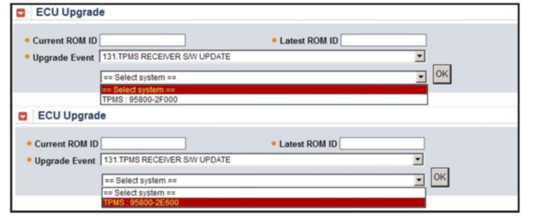 2. Within the ECU Upgrade screen, select Manual Mode in the left column, then select the appropriate 131.TPMS RECEIVER S/W UPDATE. Select the appropriate control unit part number with reference to the ROM ID Information Table and click OK.