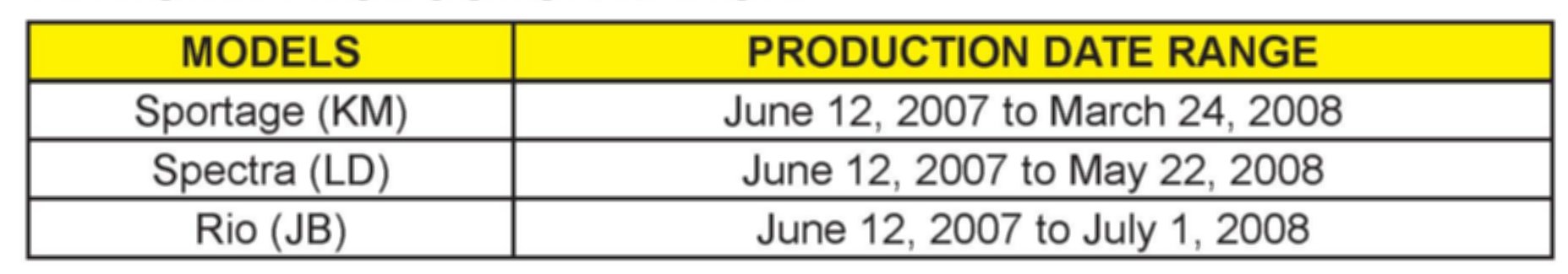 To improve customer satisfaction, Kia is requesting the completion of this Service Action on all affected 2008 Sportage (KM), Spectra (LD), Rio (JB) vehicles.