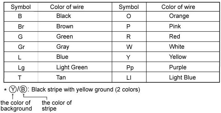The following abbreviations are used to identify wire colors in the circuit schematics.