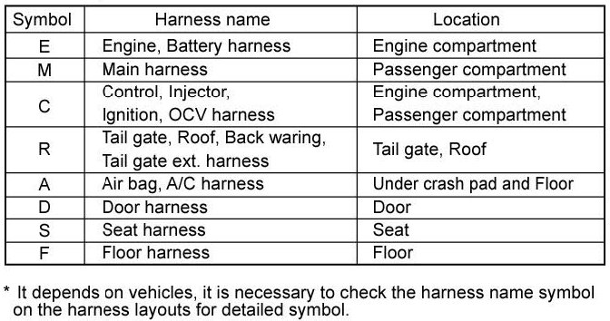 Electrical wiring connectors are classified according to the wiring parts in the Harness Layouts.
