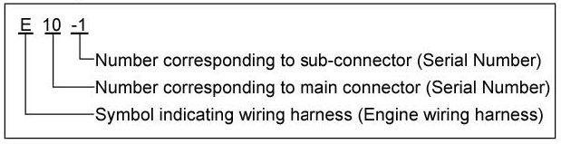 A connector identification symbol consists of a wiring harness location classification symbol corresponding to a wiring harness location and number corresponding to the connector.