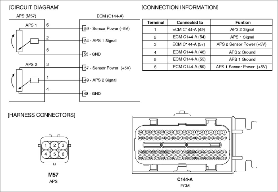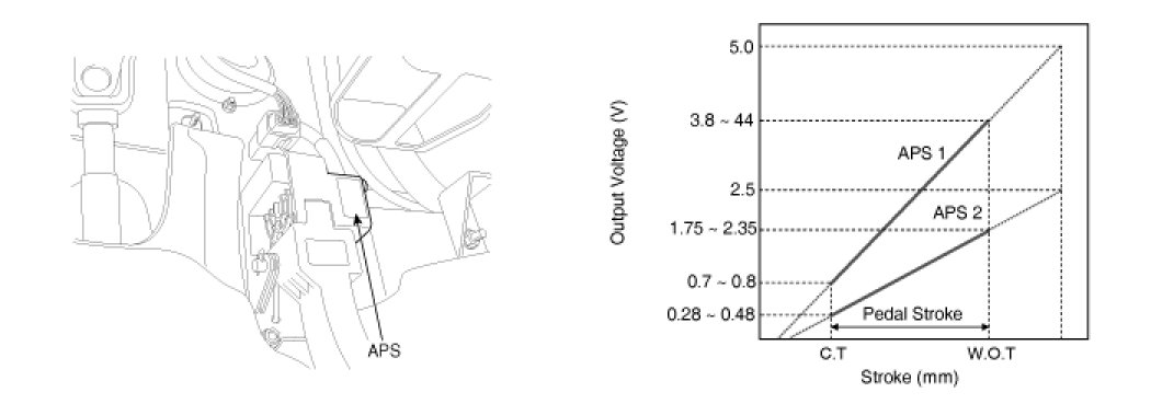 Accelerator Position Sensor (APS) is installed on the accelerator pedal module and detects the rotation angle of the accelerator pedal. The APS is one of the most important sensors in engine control system, so it consists of the two sensors which adapt individual sensor power and ground line. The second sensor monitors the first sensor and its output voltage is half of the first one. If the ratio of the sensor 1 and 2 is out of the range (approximately 1/2), the diagnostic system judges that it is abnormal.