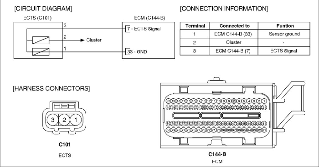 Engine Coolant Temperature Sensor (ECTS) is located in the engine coolant passage of the cylinder head for detecting the engine coolant temperature. The ECTS uses a thermistor whose resistance changes with the temperature. The electrical resistance of the ECTS decreases as the temperature increases, and increases as the temperature decreases. The reference 5 V in the PCM is supplied to the ECTS via a resistor in the PCM.That is, the resistor in the PCM and the thermistor in the ECTS are connected in series. When the resistance value of the thermistor in the ECTS changes according to the engine coolant temperature, the output voltage also changes. During cold engine operation the PCM increases the fuel injection duration and controls the ignition timing using the information of engine coolant temperature to avoid engine stalling and improve drivability.