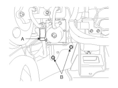 4. Remove the two HECU brake mounting bolts(B) , and then disassemble the HECU with the bracket.