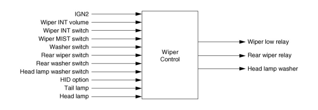 If Rear washer switch input is continued for more than 0.6, turn ON and OFF Rear wiper relay Output for 2.5~3.8 seconds after turning Rear washer switch OFF. However Rear washer switch Input during operating Rear wiper relay is ignored and received after the operation of Rear wiper relay.