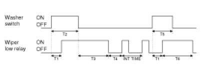 (5) If Washer switch is ON for over 0.2 second in operation of INT wiper, turn ON washer interlocking wiper output after T1. If Washer switch is ON for less than 0.2 second, turn ON Wiper low relay Output once.
