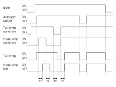 (4) If Auto light sensor value is equal to the Input value of light ON with IGN1 ON & IGN2 ON, Auto light switch ON, and light OFF, turn light ON after T1: 2.5 ± 0.2sec.