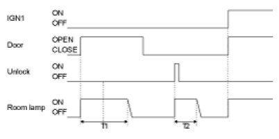 (1) C00: If (ACC=ON or IGN1=ON or IGN2=ON) or (Burglar Alarm state = 1->0) then Room lamp auto cut = ON and 20mins timer stop and 3sec timer stop.