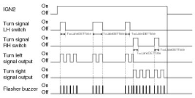 If the Left (or Right) turn switch is active and if IGN2 is On, the left (or Right) turn signal outputs are driven. The turn signal is active as long as both conditions ((Turn Signal LH switch or L_Turn Signal RH switch = On) and IGN2 = On) are true and is turned Off when one of these conditions is no longer detected.