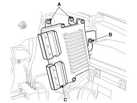 4. After removing the installation bolts (A) and nut (B), remove the ECM (C).