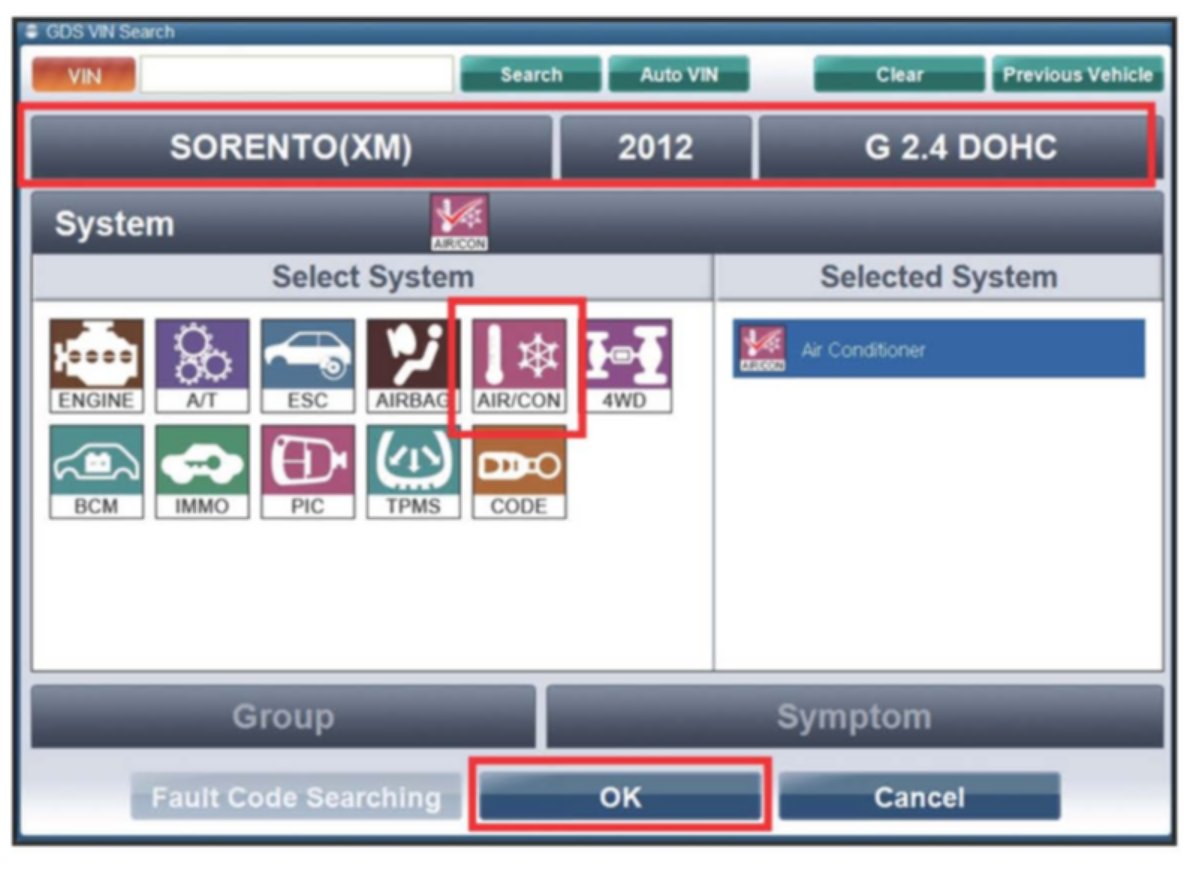 5. With the ignition key ON (DO NOT start the engine!) turn ON the VCI and GDS tool. Access the GDS vehicle identification number (VIN) screen and configure the vehicle using the VIN AUTO DETECT Function.