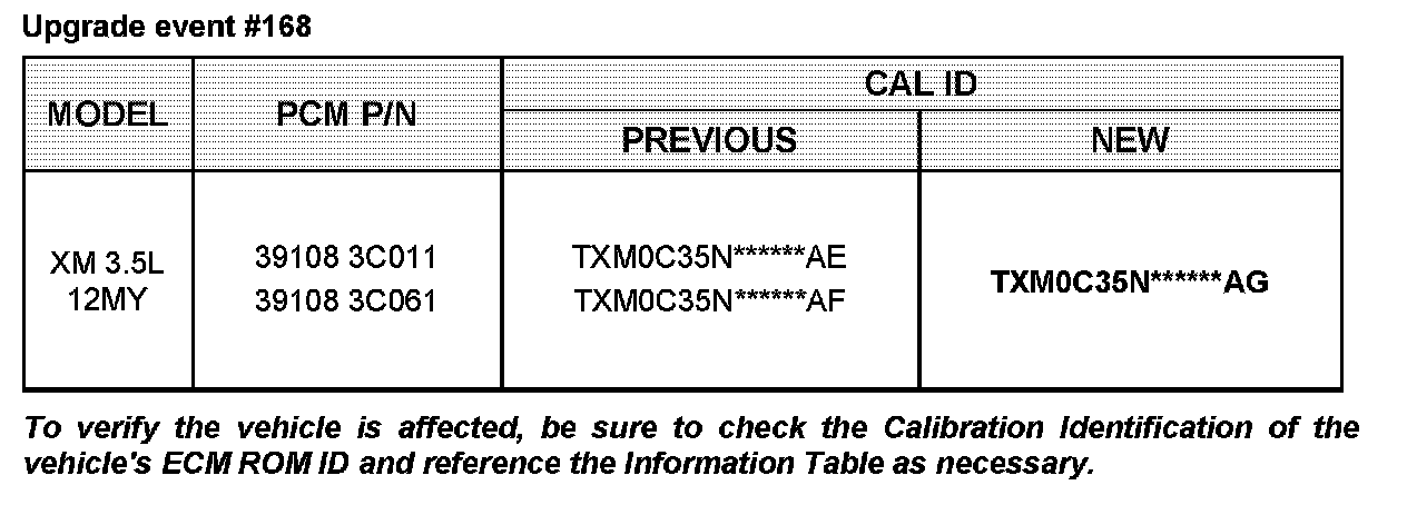 This bulletin provides information reated to the TCM software upgrade of some 2012MY SORENTO (XM) 3.5L vehicles produced from April 25, 2011 to July 25, 2011 with automatic transmission which may experience a shock and abnormal noise when the engine starts after long-term parking. For confirmation that the latest reflash has been done to a vehicle you are working on, verify ROM ID using the tables in this TSB. To ensure maximum customer satisfaction Kia is requesting the completion of this Service Action on all affected 2012MY vehicles.