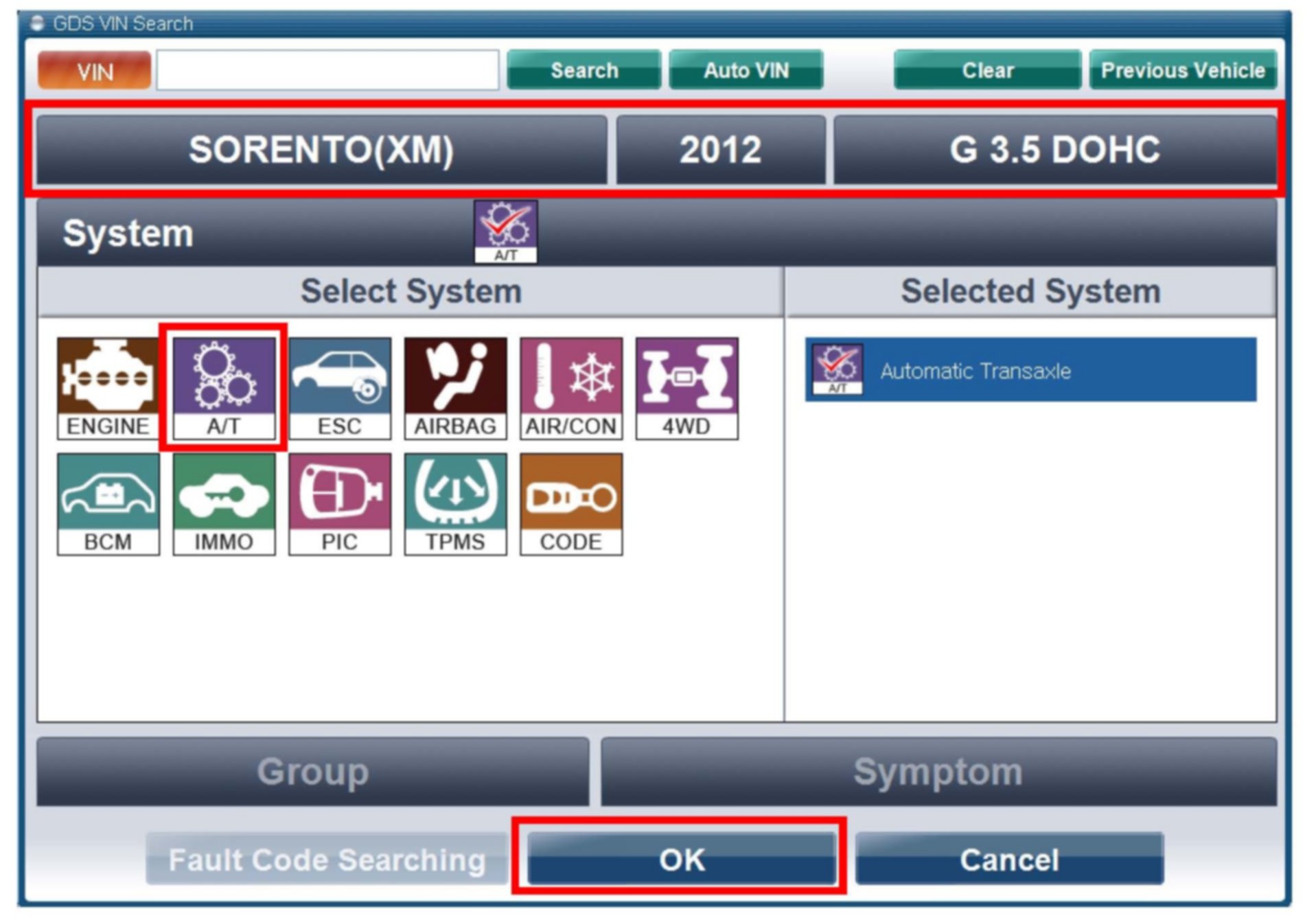 5. With the ignition key ON, turn ON the VCI and GDS tool. Access the GDS vehicle identification number (VIN) screen and configure the vehicle using the VIN AUTO DETECT function.