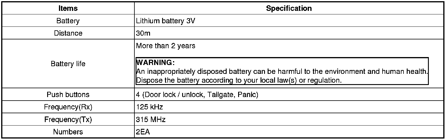 Keyless Starting System: Specifications
