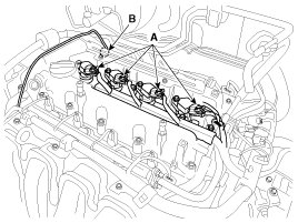 24. Connect the ignition coil connectors (A) and the exhaust CMP (Camshaft position sensor) connector (B).