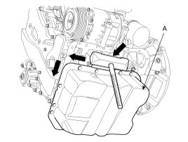 12. Remove the oil pan (A). Insert the blade of SST (09215-3C000) between the ladder frame and oil pan. Cut off applied sealer and remove the lower oil pan.