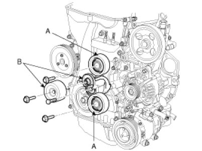 14. Install the drive belt tensioner (B) and tensioner pulley.