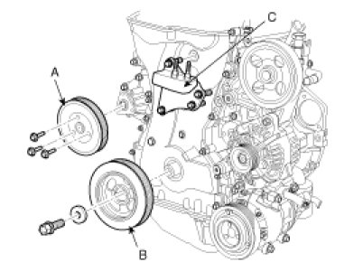 17. Remove the water pump pulley (A), crankshaft pulley (B) and engine support bracket (C).