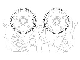 4. Set the crankshaft so that the key (A) of crankshaft will be aligned with the mating surface of main bearing cap. Put the intake and exhaust camshaft assembly so that the TDC marks (B) of the intake and exhaust CVVT sprockets will be aligned with the top surface of cylinder head. As a result of this, the piston of No.1 cylinder is placed at the top dead center on compression stroke.