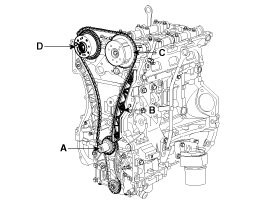 Crankshaft sprocket (A) -> Timing chain guide (B) -> Intake CVVT sprocket (C) -> Exhaust CVVT sprocket (D).