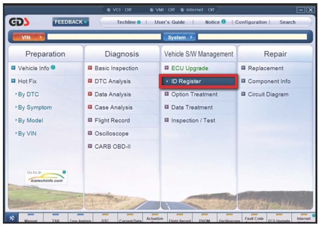 2. To start use the Global Diagnostic System (GDS). Begin by clicking on "ID Register" Click on "Auto VIN" or manually enter vehicle information on the next screen