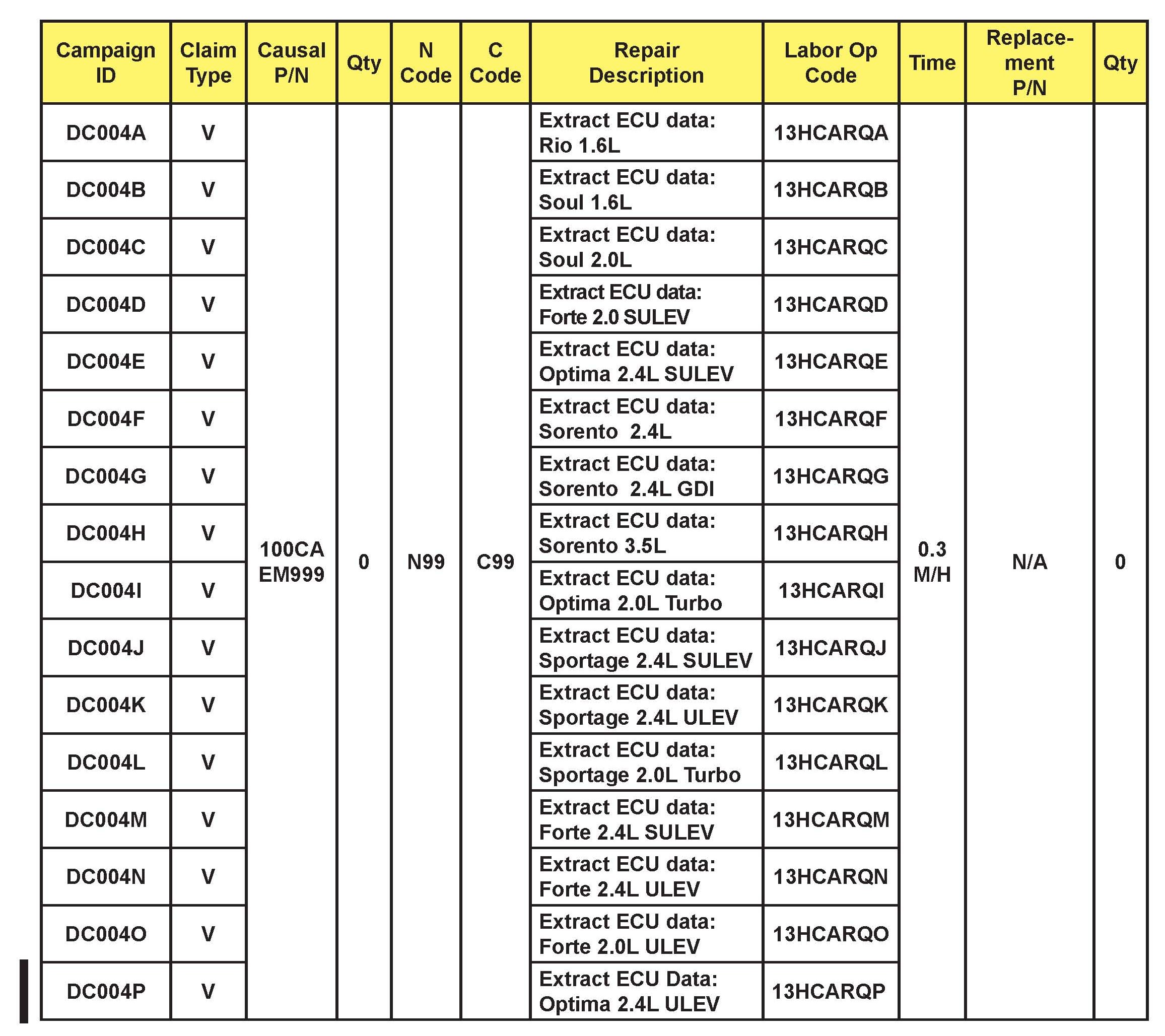 VIN inquiry data for this repair is provided for tracking purposes only. Kia retailers should reference DC004 when accessing the WebDCS system.