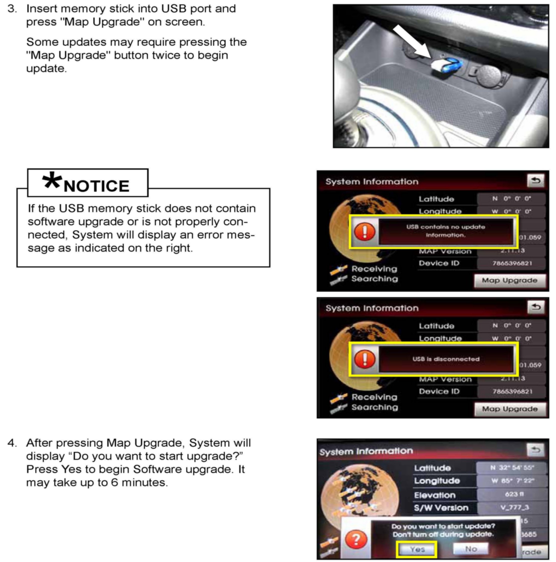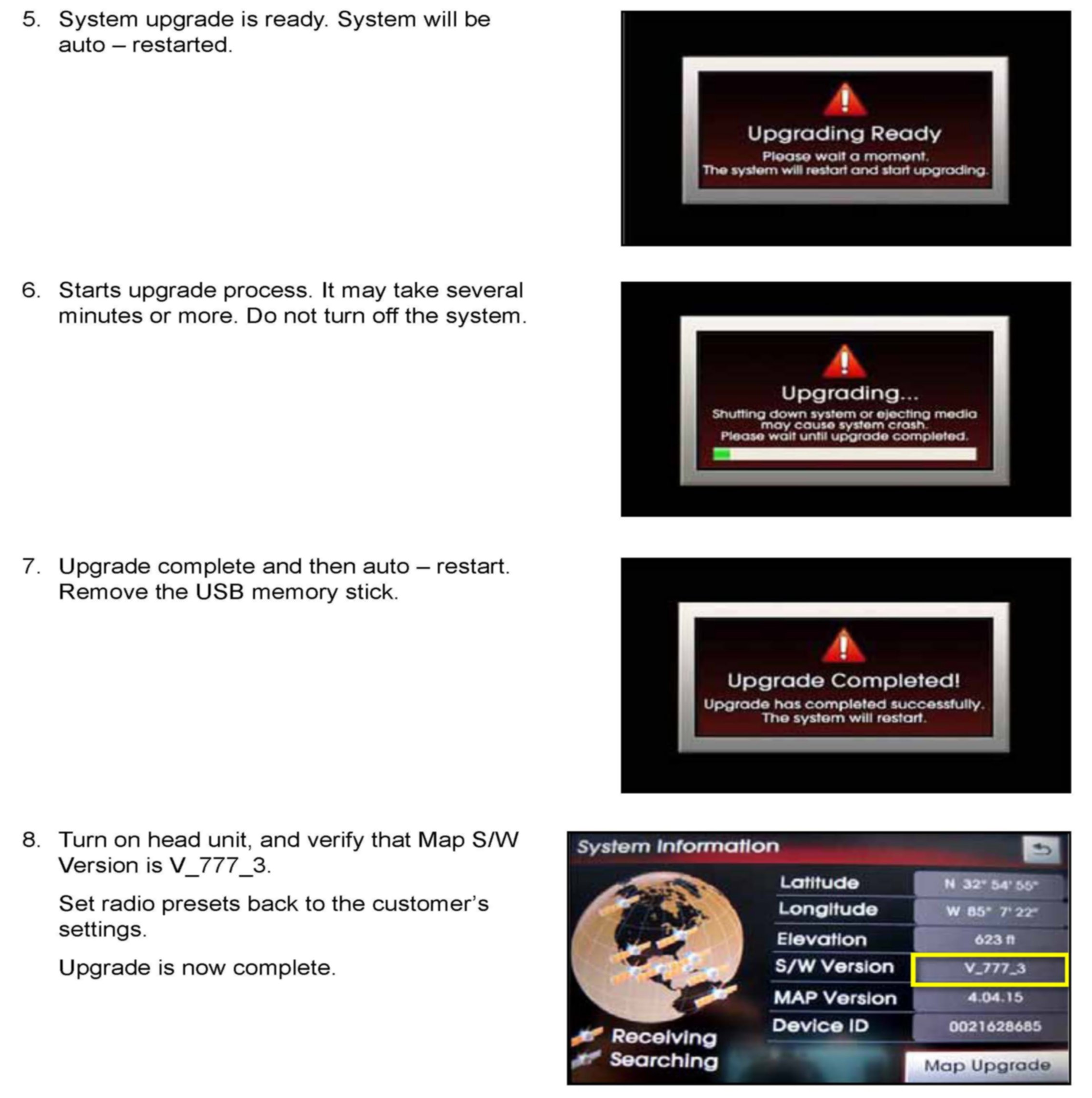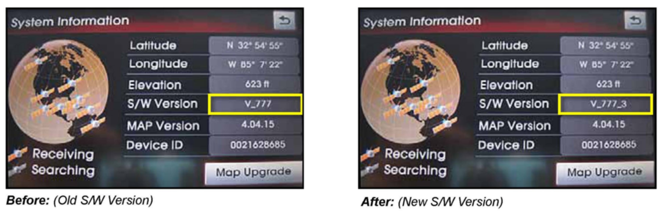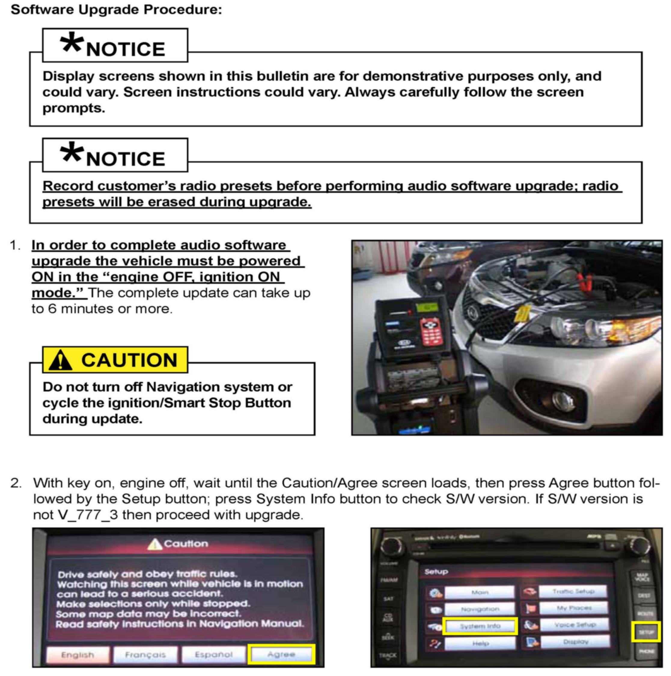 This bulletin describes the procedure to update the software in the 2012-2013MY Sorento vehicles produced from September 28, 2011 to March 13, 2012 with Navigation system (AVN). Navigation Software version V_777 should be upgraded to V_777_3 to prevent the Caution/Agree screen from freezing up. If Navigation Software version is V_777, follow the procedures outlined in this TSB. Kia is requesting the completion of this Service Action on all affected vehicles in dealer stock prior to delivery. Before conducting the procedure, verify that the vehicle is included in the list of the affected VINs.