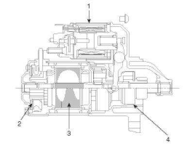 As the start relay coil (-) is grounded by PCM, the start relay is operated, and the current applied to the start motor ST terminal by the start relay switch terminal magnetizes the solenoid so that when the magnetic switch and lever are pulled, the pinion gear and the ring gear are geared and the magnetic switch contact is closed so that the B+ high current rotates the motor to drive the engine. After the engine starts operating, the pinion gear clutch is over-run to prevent damage from excessive revolutions of armature.