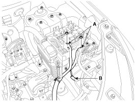 11. Disconnect the (+) cable (A) from the fuse/relay box and the front connector (B). Then remove the wiring protector.