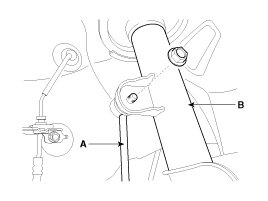 26. Disconnect the ground line (A), and then slowly loosen bolts to engine mounting bracket (B),and lower engine and transaxle assembly onto floor jack.