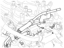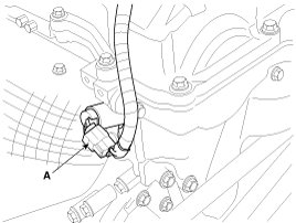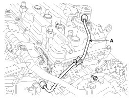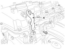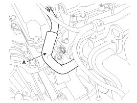 26. Connect PCSV (Purge control solenoid valve) connector (A) and tighten the vacuum & PCSV (Purge control solenoid valve) pipe assembly mounting bolts and nut.